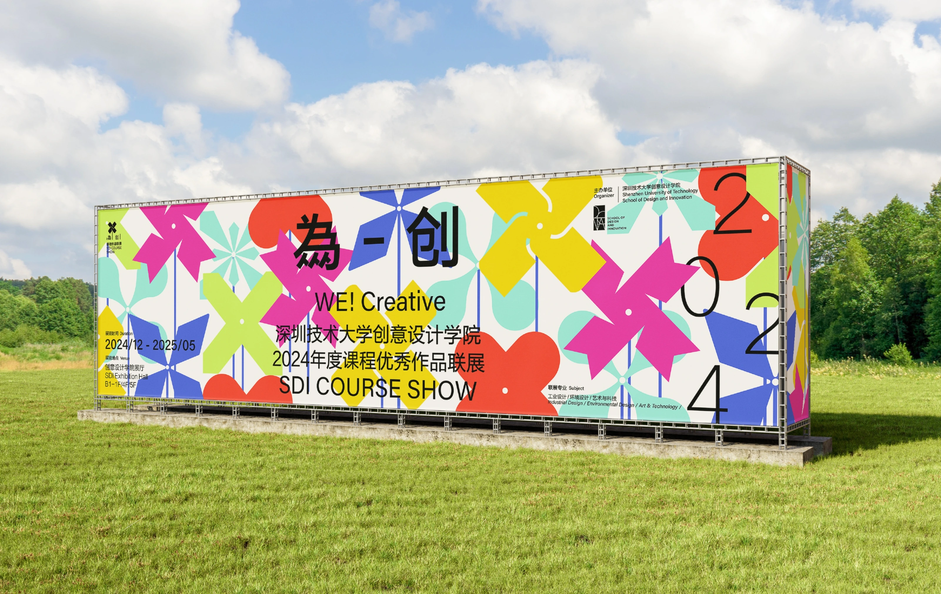 客户希望以“ X ”为创意原点,我们通过解构重组,巧妙的将其转化为一组富有生命力的风车阵列。叶片的多彩与多变,象征学生群体的个性化创造力与无限可能;风车挺拔的形态与旋转的动势,暗喻教育带来的持续成长动力;构图放射状,构建出青春绽放、未来可期的空间想象。