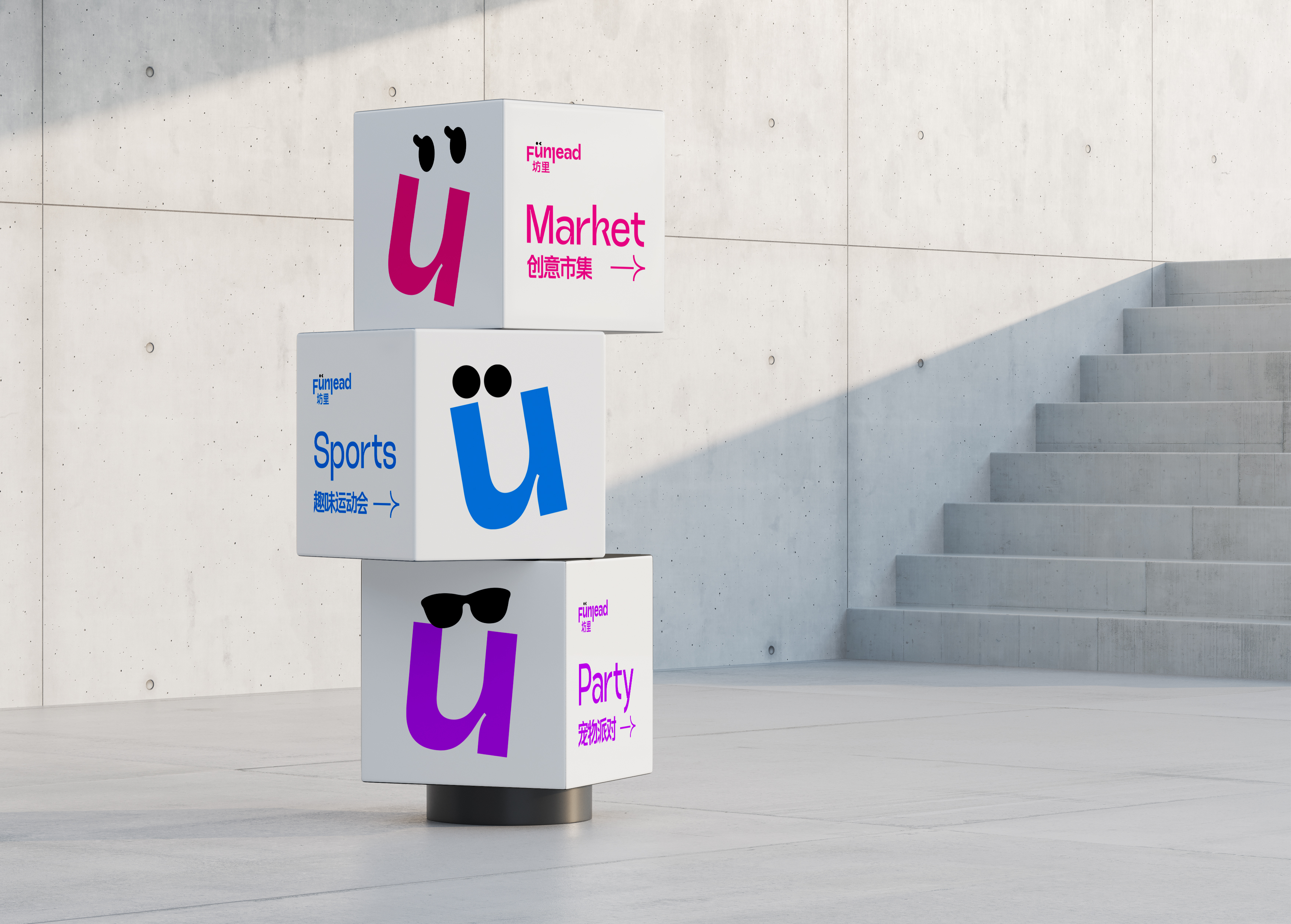 标志设计的点睛之笔是通过不同的表情符号表达Fun的主题,不同的“U”既是不同的“You-你”,生动地展现了来到“坊里”的人们的多样情绪:欢乐、惊喜、喜爱、放松等等,增强品牌视觉的趣味性和互动性,更容易引发年轻用户的共鸣。这些表情符号也象征着Funlead品牌的欢乐、开放和包容精神,欢迎不同背景、不同个性的人们在此相聚,分享快乐。